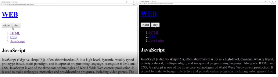 Javascript의 가장 중요한 역할는 사용자와 상호작용할 수 있게 하는 것입니다. 아래의 웹페이지에서 사용자가 night/day 버튼을 누를 때마다 페이지의 색깔이 바뀌는 것을 그 예시이죠.