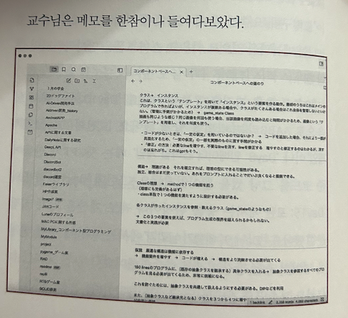 저자는 굉장히 빠르게 논문을 작성하곤 했는데, 어느날 교수가 "너는 어떻게 그런걸 다 기억하고있는거야" 라고 물었을 떄, "기억이 아닌 메모" 라고 대답한 부분이 있습니다.