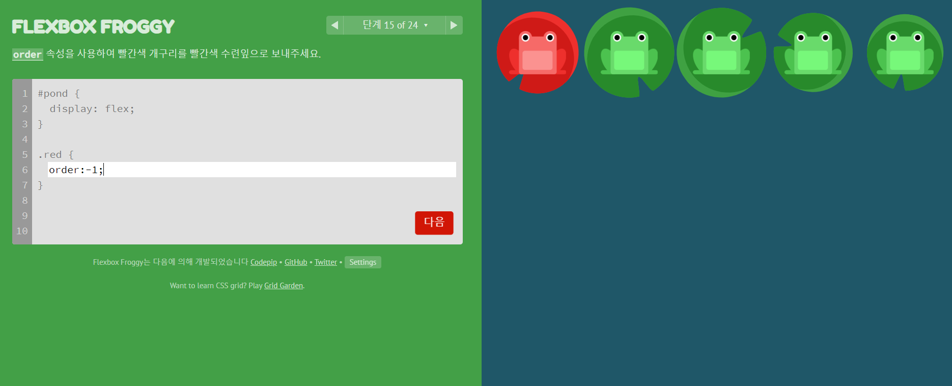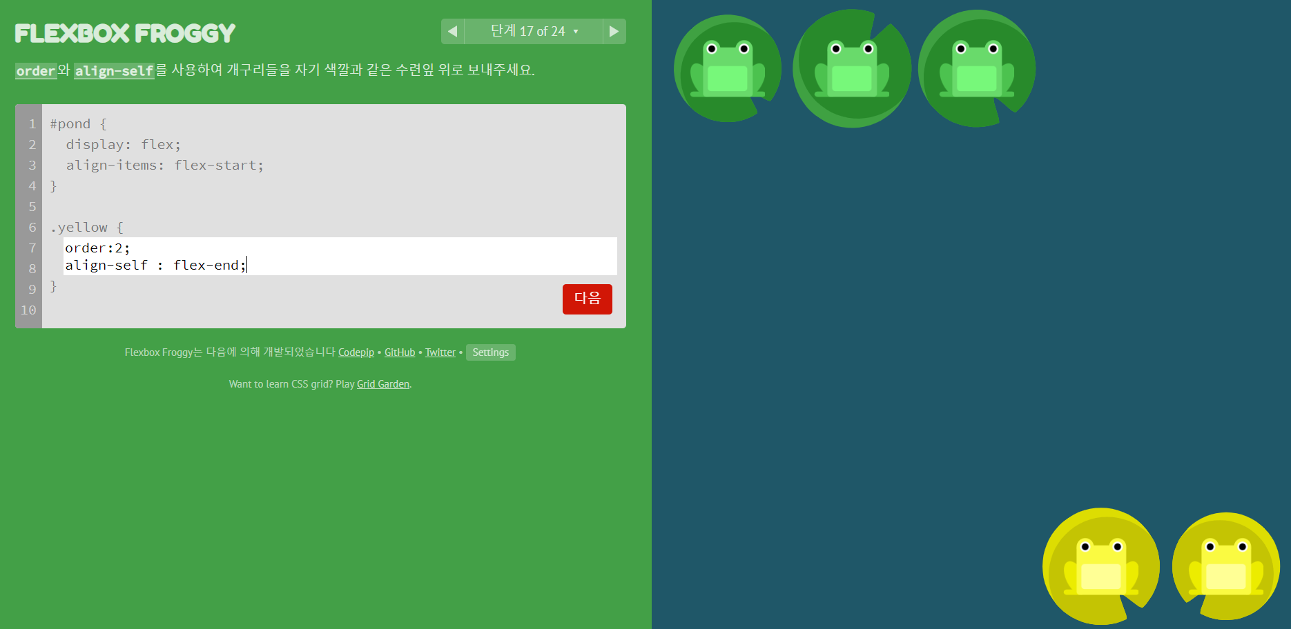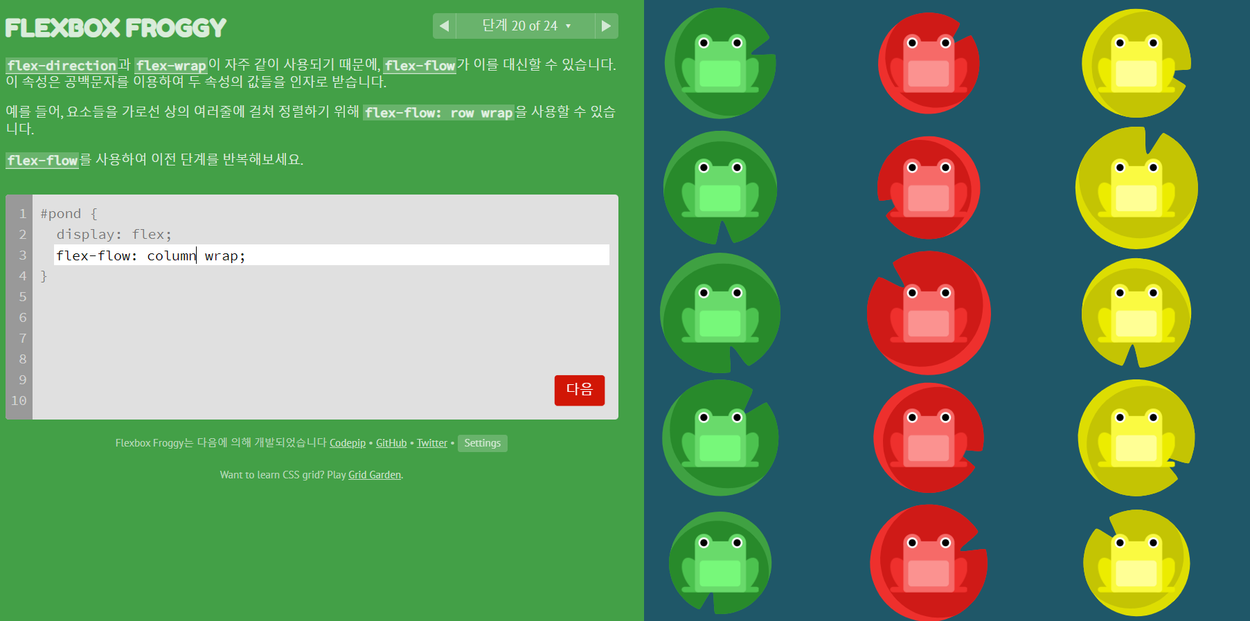 | [FLEXBOX FROGGY] CSS 개구리 게임 4(21~24) (0) | 2021.08.09 |