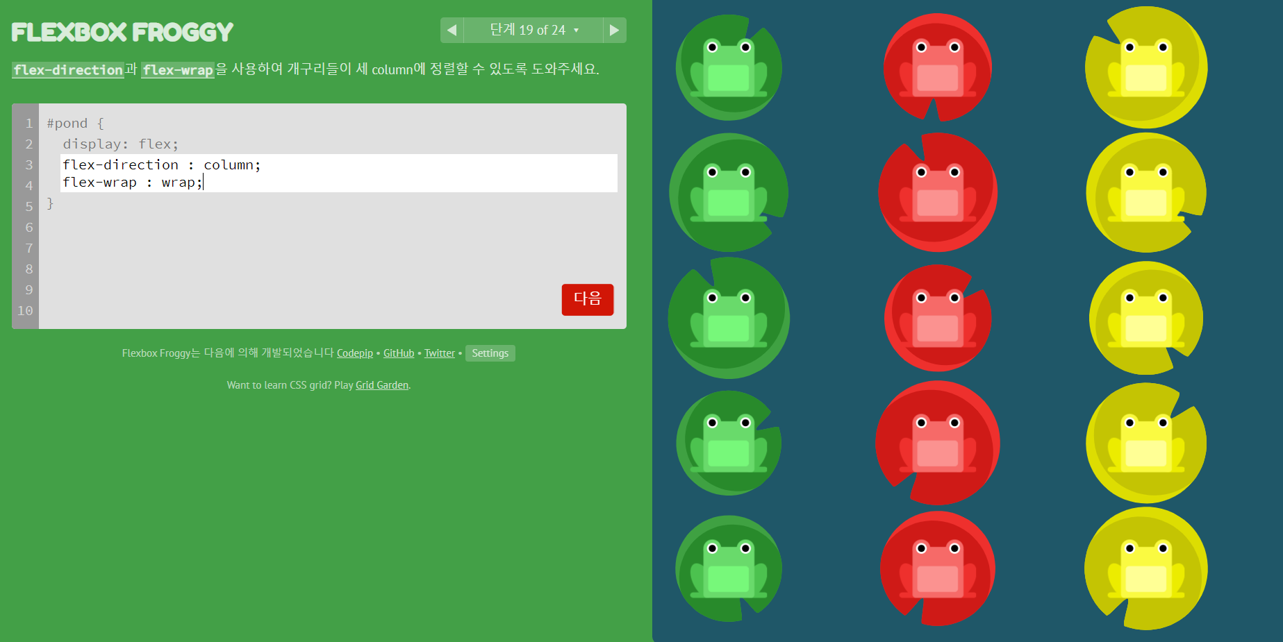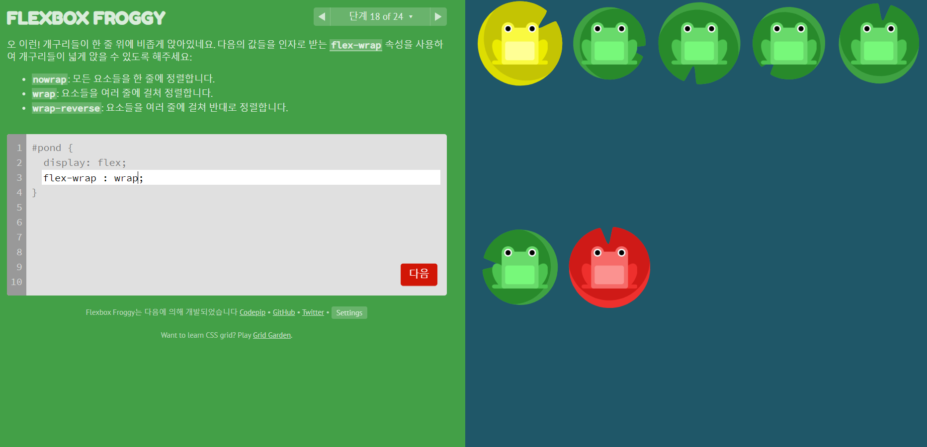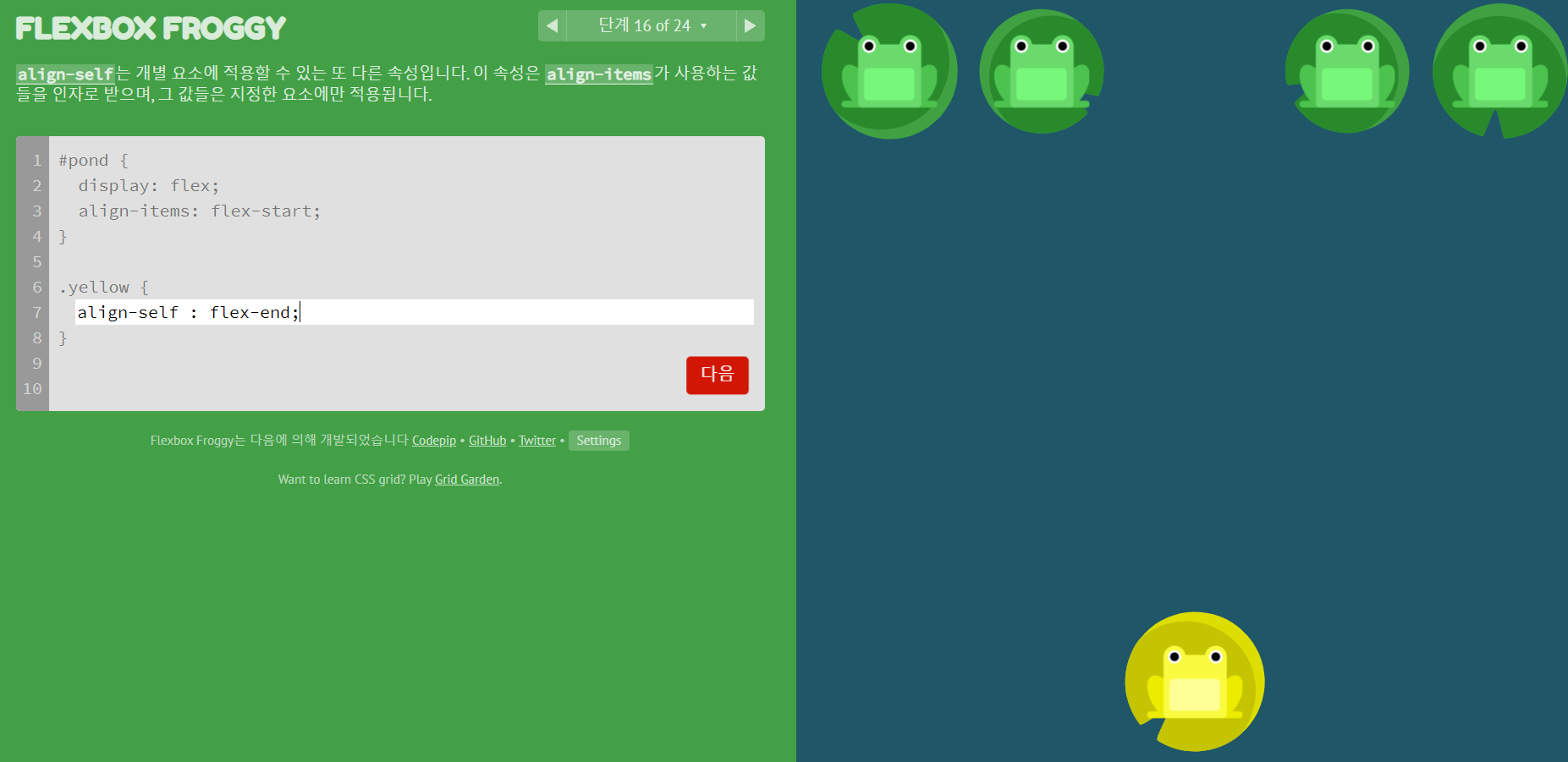 | [FLEXBOX FROGGY] CSS 개구리 게임 4(21~24) (0) | 2021.08.09 |