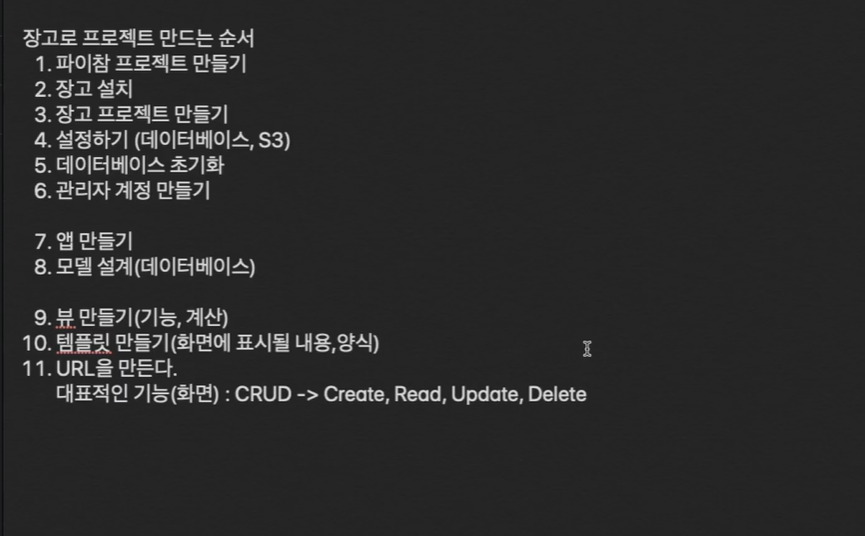 장고 프로젝트 진행 순서는 아래의 순서를 참고 진행하려 한다.
