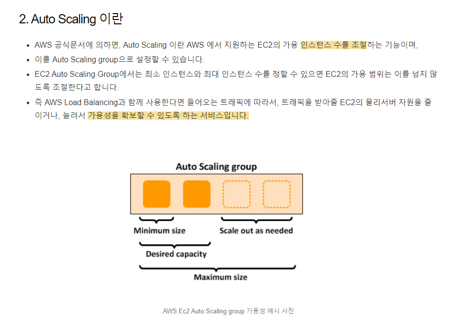 AWS 단일 EC2 서버에 Auto Scaling 을 적용하기전 공식문서를 읽고 정리한 글 입니다. AWS 생태계에서 EC2 Auto Scaling 은 작은단위의 서비스로써, AWS의 다양한 서비스에 거의대부분 적용되는 서비스 같다. 모듈식으로 서로서로 연계되는 AWS에서 Auto Scaling 알아보자! [목차] Auto Scaling 을 사용하고자 하는 이유 Scale up 과 Scale Out Blue Green 배포 Auto Scaling 이란 Auto Scaling 특징 및 장단점 AWS EC2 Auto Scalig Group 적용 하기 1. Auto Scaling 을 사용하고자 하는 이유 Scale up 과 Scale Out 인프라를 확장하는 2가지 개념 scale up : 인프라 자체의 성능..