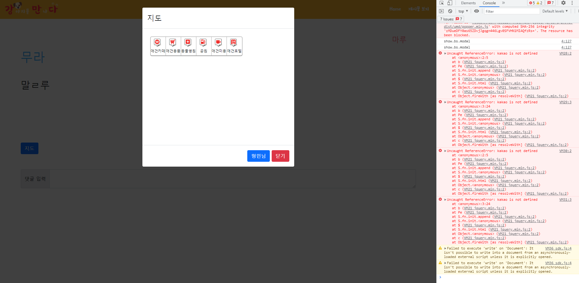 .attr(attributeName) 선택된 요소 집합에서 첫번째 요소의 attributeName에 해당하는 속성값을 반환한다. .attr(attributeName, value) 선택자에 의해 선택된 요소에 하나 이상의 속성을 부여할 수 있다. 여러 속성을 부여할 때, 속성명에 따옴표는 선택사항이다. 단, "class"속성을 세팅할 때는 반드시 따옴표를 사용해야 한다. Internet Explorer는 input이나 button요소의 type속성을 바꾸지 못한다. $('#go-map').attr("src",href) 참고 https://solbel.tistory.com/365